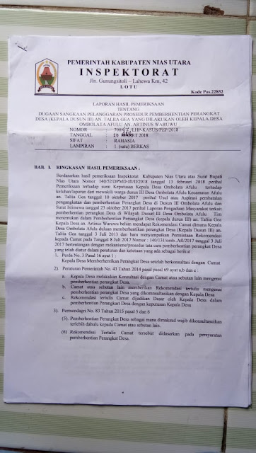 Saat itu inspektorat Kabupaten Nias Utara mengeluarkan LHP dimana dalam laporan hasil pemeriksaan tersebut, Inspektorat Kab. Nias Utara menemukan bahwa pemberhentian perangkat desa yang dilakukan oleh Kades Ombolata Afulu an. Artinus Waruwu bertantangan dengan mekanisme/prosedur tata cara pemberhentian perangkat desa yang telah diatur dalam peraturan ketentuan yang berlaku.