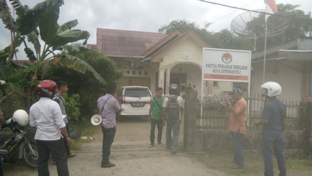 Puluhan massa yang tergabung dalam Relawan Biru JR-Ance Kepulauan Nias menggelar aksi demonstrasi di halaman Kantor Panwaslu Kota Gunungsitoli, Jl. Supomo, Desa Mudik, Kecamatan Gunungsitoli, Kota Gunungsitoli, Senin (19/3)