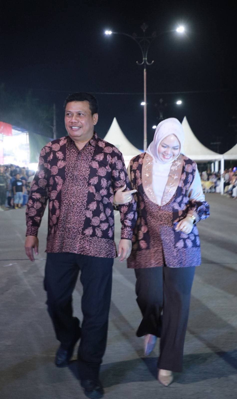 Wakil Bupati Tanjung Jabung Barat, Dr. H Katamso, SA SE ME didampingi Ketua Gabungan Organisasi Wanita (GOW) Kabupaten Tanjung Jabung Barat, Marina Septiani, SIP menghadiri acara Tungkal Fashion Street 2 dalam rangka memperingati Hari Batik Nasional Tahun 2025 dengan tema “The Greatest of Fathers” yang digelar di Alun-Alun Kota Kuala Tungkal, Sabtu malam (4/10).