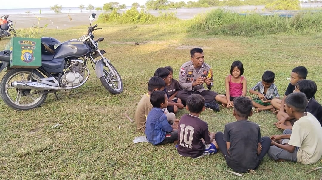 Dengan langkah mantap di atas pantai berlumpur, Bhabinkamtibmas Desa Sendaur dan Desa Kayu Ara, Polsek Rangsang, Polres Kepulauan Meranti, Brigadir Khairi, mengajak anak-anak Suku Akit menanam puluhan bibit pohon mangrove di kawasan Pantai Gelombang Cinta, Kecamatan Rangsang Pesisir, Kamis (23/10/2025) pagi.