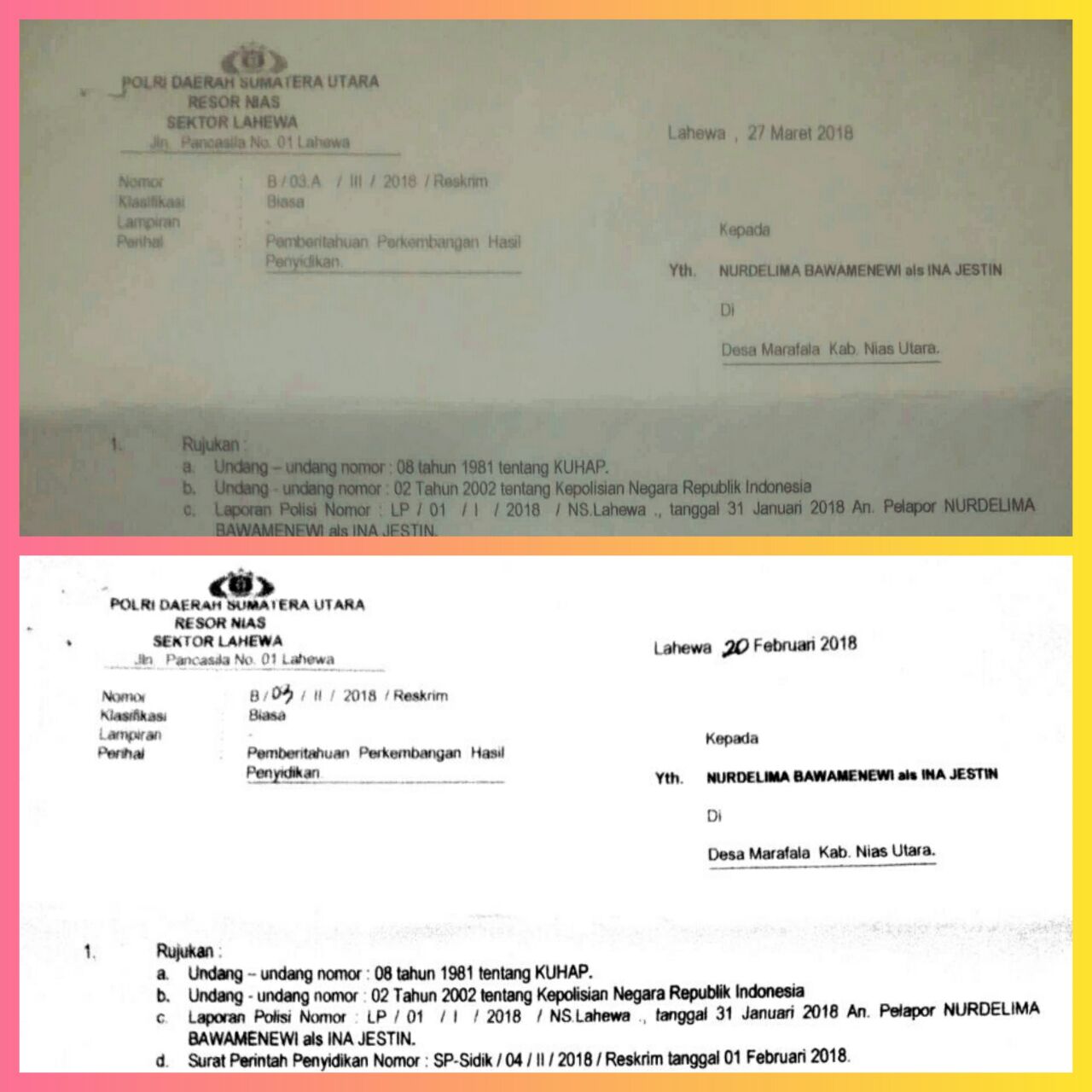 Dalam surat pmberitahuan pengembangan hasil penyelidikan tersebut dijelaskan bahwa Polsek Lahewa telah mendatangi Tempat Kejadian Perkara (TKP). Penyidik telah meningkatkan proses penanganan perkara dari proses penyelidikan ke tahap penyidikan, melakukan pemeriksaan saksi-saksi, dan telah meminta hasil visum et repertum dari Puskesmas Lahewa.