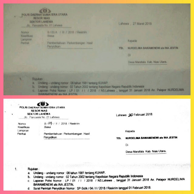 Lebih lanjut Benny mengatakan bahwa Polsek Lahewa telah menyurati NB (pelapor) tertanggal 27 Maret 2018 perihal pemberitahuan pengembangan hasil penyelidikan (PPHP).