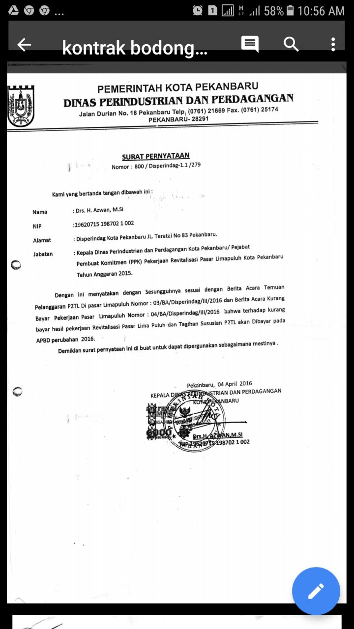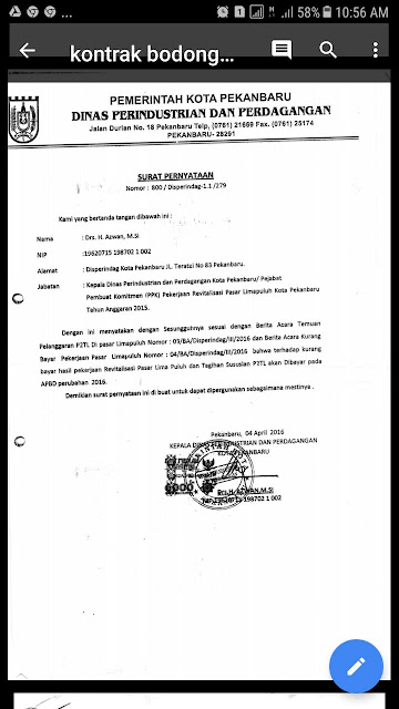 Hal ini diperkuat dengan temuan surat pernyataan Kadis Perindag Kota Pekanbaru yang berani membuat kebijakan bahwa kekurangan uang dari proyek APBN itu akan ditombok melalui APBD Perubahan melalui Surat Nomor 800/Disperdindag-1.1/279 tertanggal 4 April 2016. Lalu uang 2 persen dari APBN sebelumnya yang semestinya penuh kemana menghilangnya ? Sehingga harus dibebankan pada APBD Kota Pekanbaru.