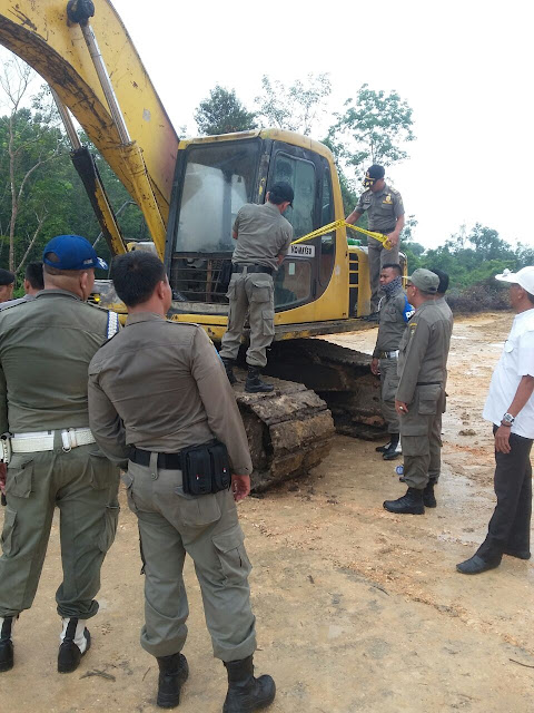 Alat berat ekskavator yang disegel dengan garis Pol PP dan pintu ditutup dan disegel, untuk alat tidak ada penangkapan hanya disegel bahwa pemberitahuan tim sudah datang.