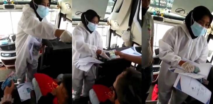 Video seorang wanita memakai baju hazmat lengkap yang diduga menjual surat bebas Covid-19 di dalam bus viral di media sosial. Dalam video yang berdurasi 1 menit 34 detik itu, terlihat seorang wanita berdiri di samping kursi supir bus terekam tengah membagi-bagikan surat bebas Covid-19 dengan memanggil sejumlah nama penumpang.